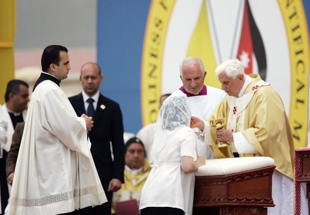 Mas por que, Bento XVI está agora, dando a comunhão na boca e de joelhos? O Papa está fazendo isso porque ele acredita que nós estamos correndo um risco muito grande de perder a devoção e a fé na Eucaristia, pois, infelizmente, em algumas igrejas, a presença de Jesus Eucarístico está se tornando uma piada.
